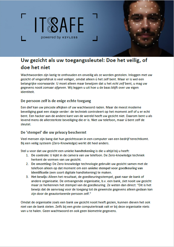 ItsSafe kan worden gebruikt als aanvulling op bestaande kennis gebaseerde authenticatie of kan deze volledig vervangen. Het enige dat we nodig hebben is een selfie.